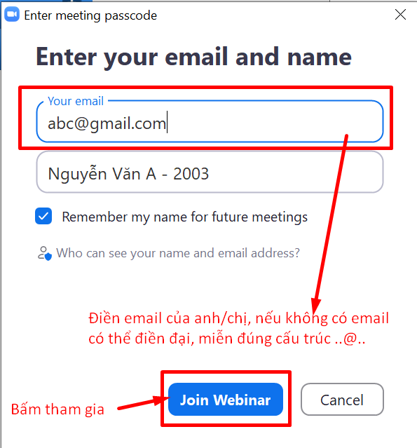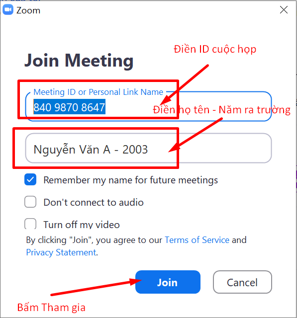 Lưu ý: Cách đặt tên khi tham dự meeting online: Họ Tên - Năm tốt nghiệp ra trường.