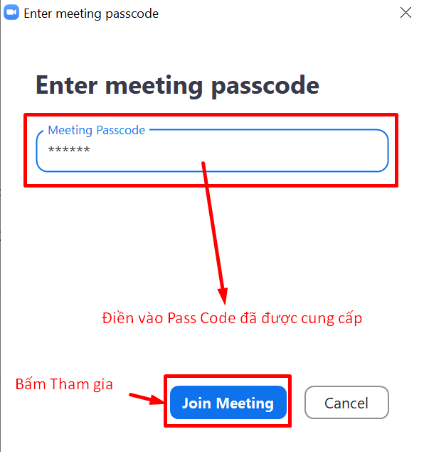 Bước 2: Tham gia cuộc họp bằng ID và PASS CODE: