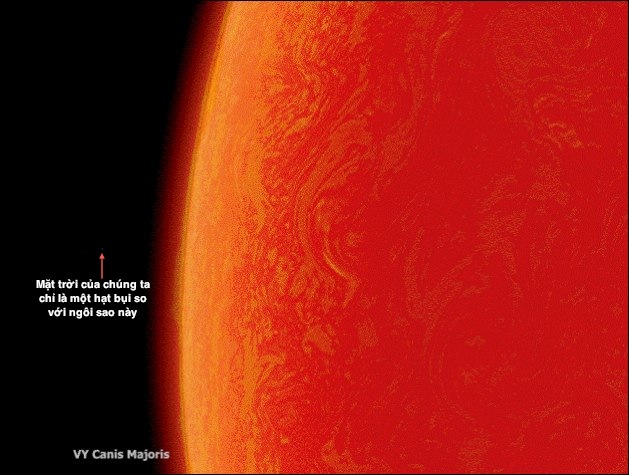 VY Canis Majoris là một vị khổng lồ so với hạt bụi là Mặt Trời của chúng ta, nhưng ngôi sao này vẫn chỉ là một chấm nhỏ, một hạt bụi so với hàng tỉ tỉ ngôi sao khác đang có mặt trong dải Ngân Hà, và dải Ngân Hà của chúng ta thì vẫn chỉ là một thiên hà nhỏ so với hàng tỉ tỉ thiên hà khác trong vũ trụ.